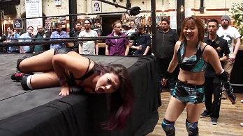 Nixon’s match against Mayu started on the canvas but got more brutal, including Iwatani brutalizing Nixon with her strong style offense. Just when Mayu thought she had the match won, the ten minute time limit expired. The crowd wanted five more minutes. It was given. Just when Nixon thought she had it won, the extra five minutes expired. Due to the draw, both advanced to the finals making it a three way match.