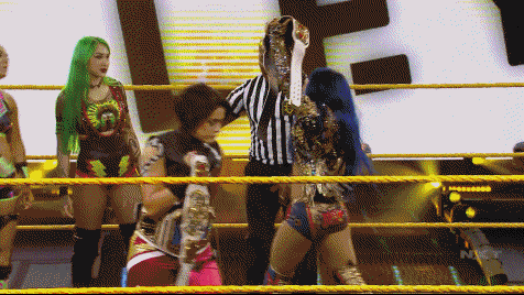Shotzi got the upperhand applying cattle mutilation to Sasha who was overtaken with sheer pain. Reeking in desperation, Bayley brought a chair into the ring seeking a disqualification since titles can only change on pinfalls or submissions. Tegan literally put her foot down on that, however the referee's attention was turned away from Banks in the submission to Tegan holding a chair. Nox tossed the chair aside but in the meantime, Bayley used the distraction to assist Sasha over Shotzi so she could reverse into the Bank Statement, forcing the drained Blackheart to tap out.
