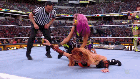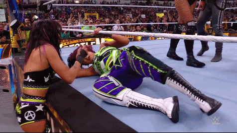 The action spilled back and forth. Our Captain kicked back into the fray, sending Lita to oblivion and back with the Kaio-Kick. Stratus took Kai to the canvas with the Stratusfaction. The chaos went back to the floor. SKY got her first iconic IYO WrestleMania Moment, gliding off the top rope to everyone on the floor with a moonsault. The referee was counting to ten. Everyone barely made it back into the ring to break the count. The war continued. Everyone squared off and fought to a finish.