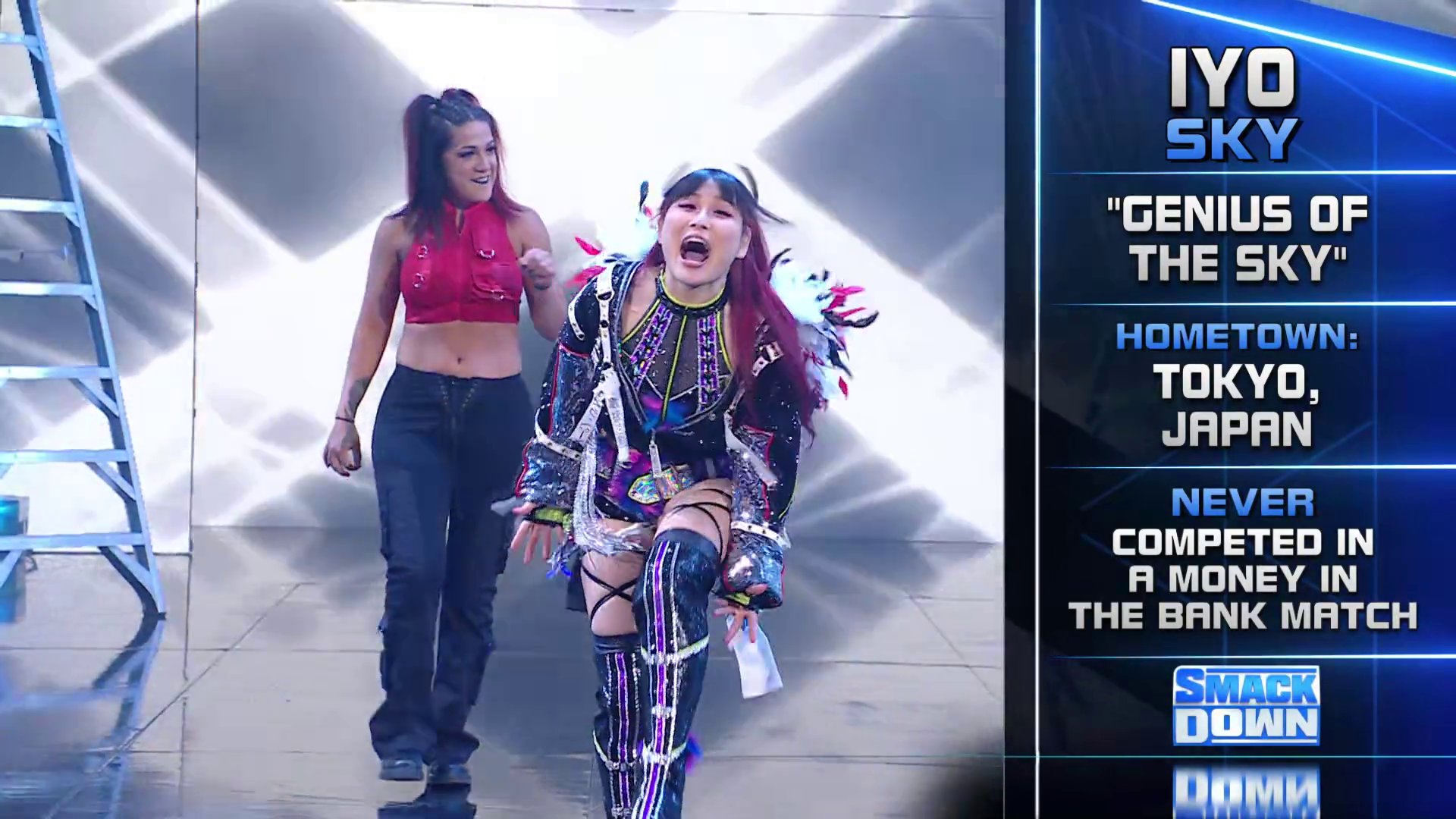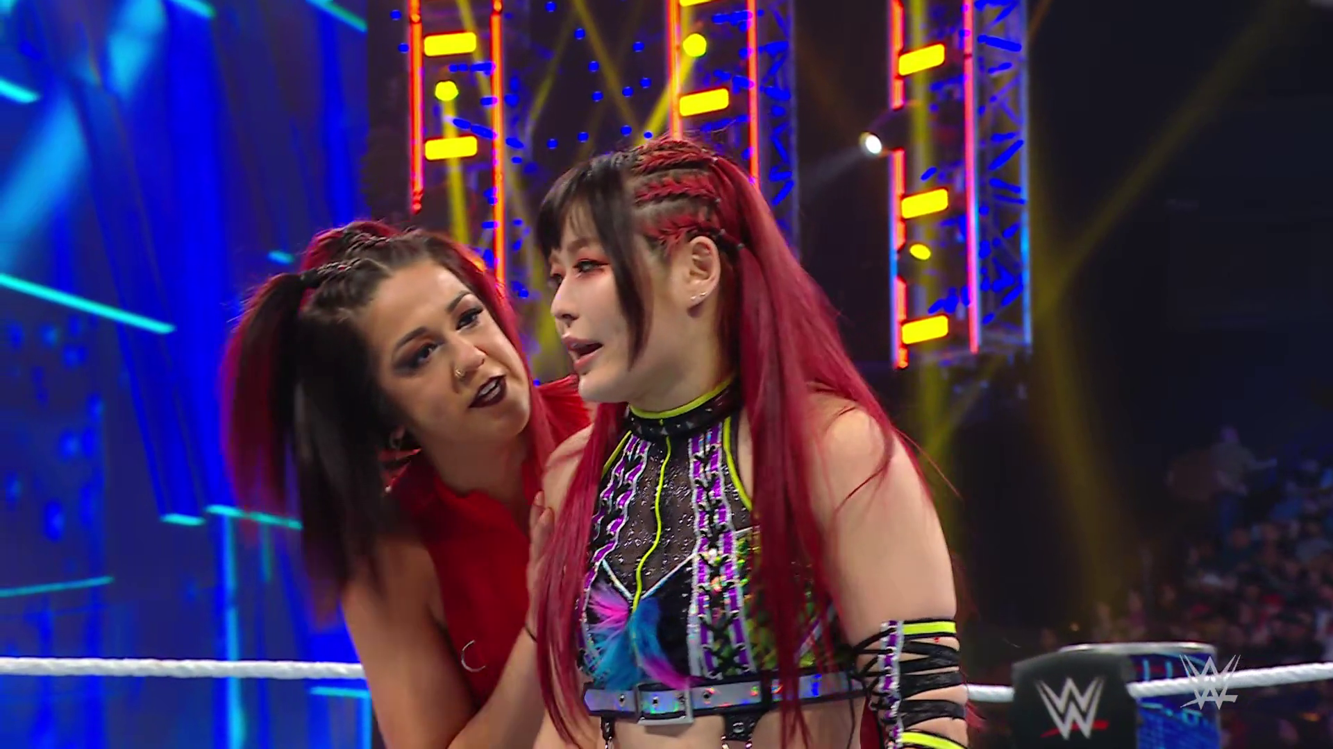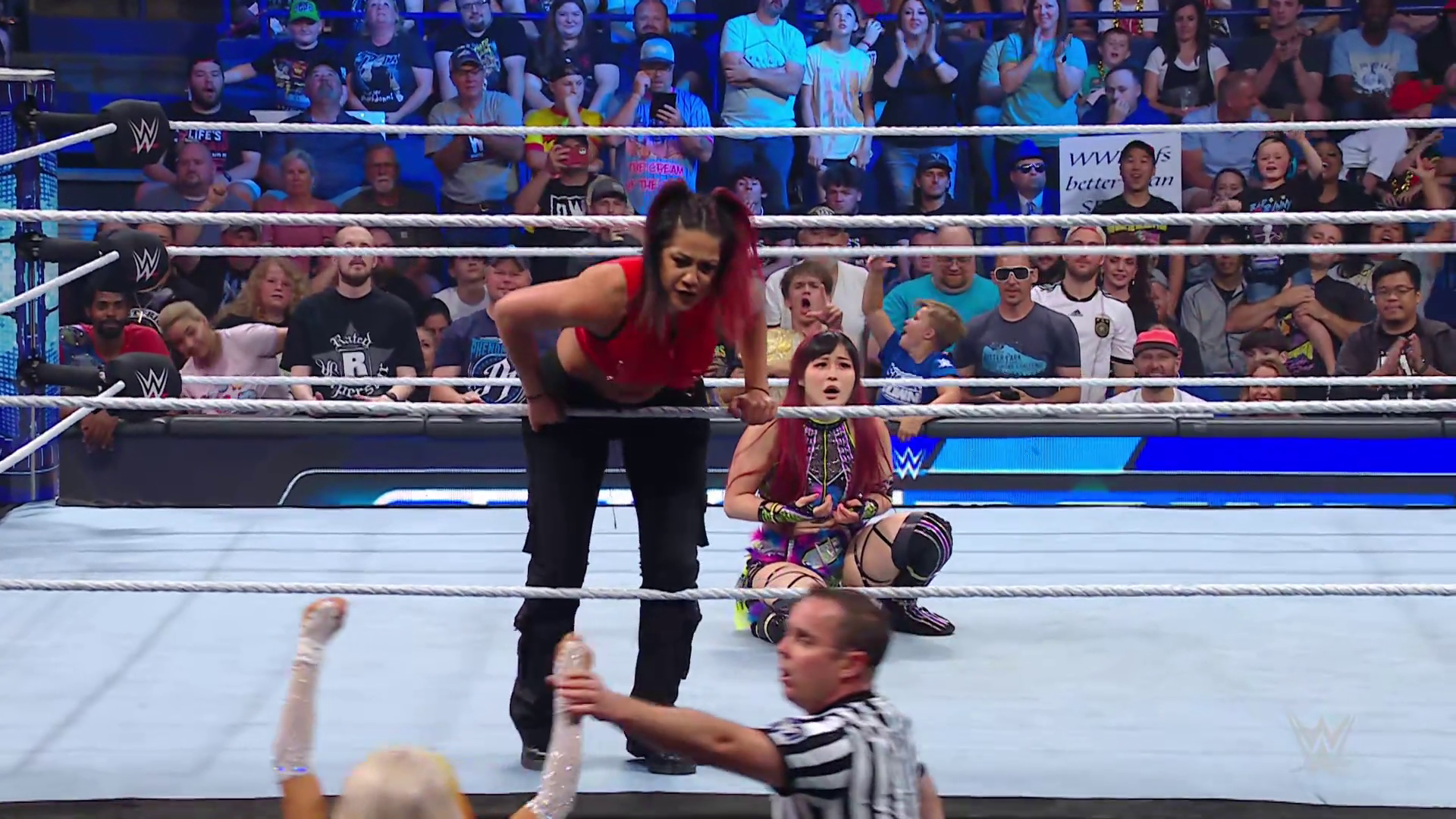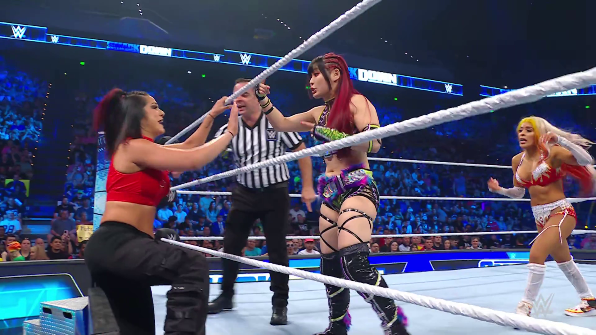 On the June 16th 2023 episode of SmackDown, IYO faced Zelina. Bayley got up on the apron to provide a distraction to assist SKY. IYO came up behind Vega to roll her up for a pin only for Zelina to counter with a waistlock. SKY nearly collided with Bayley. The referee was distracted admonishing Bayley, missing SKY countering Vega's waistlock into a roll-up. Bayley shouted at the referee to return his attention to the match, pointing at the pin. The referee was too late and Vega kicked out. IYO turned her gaze to Bayley, shouting aggressively at her.