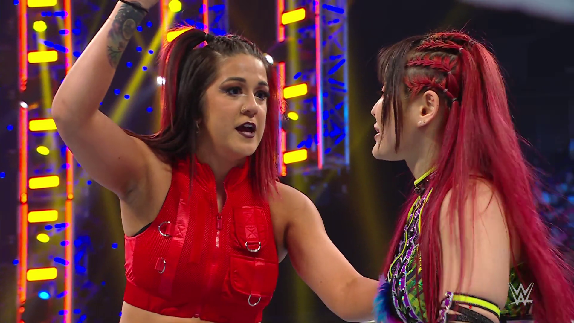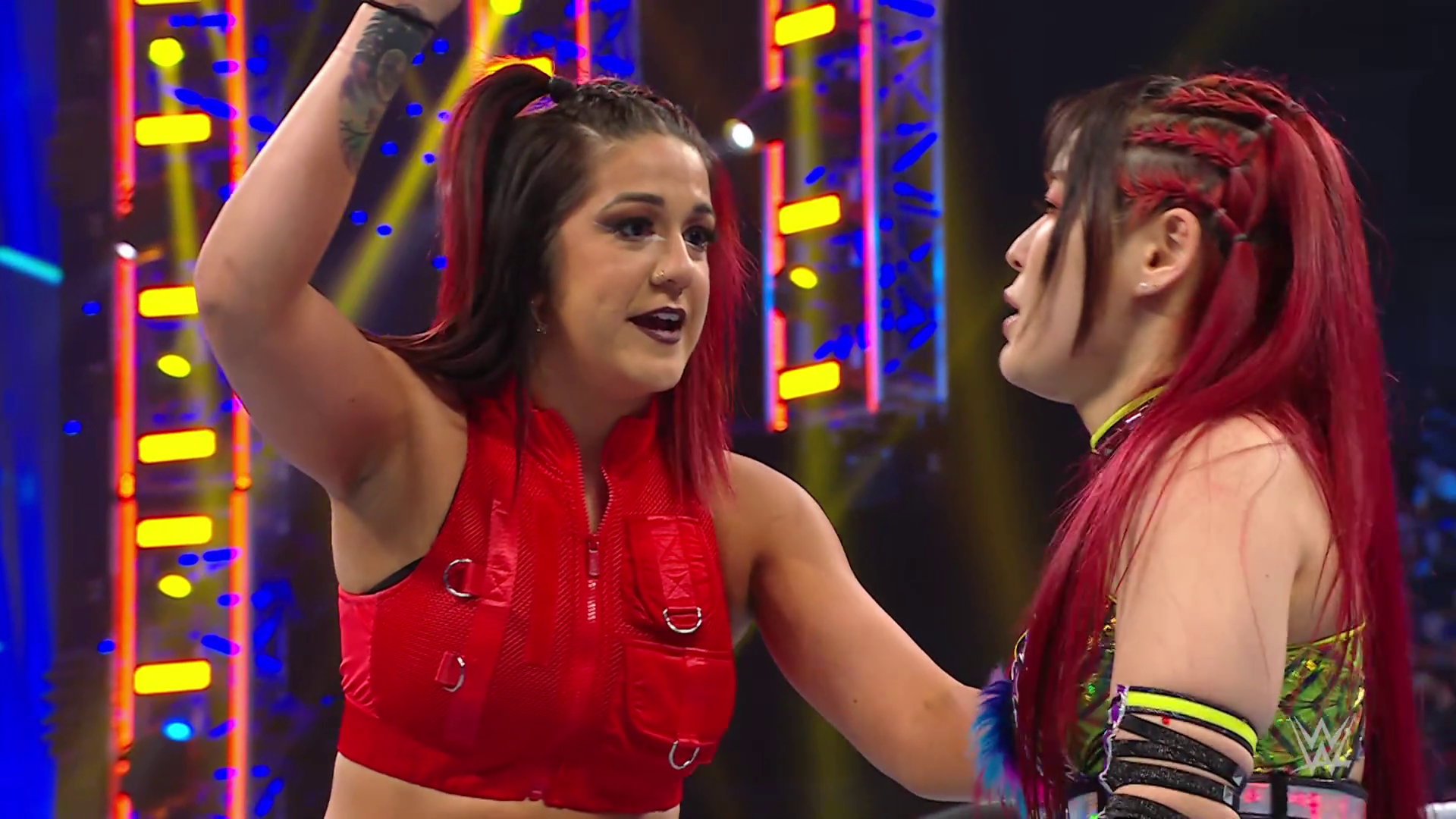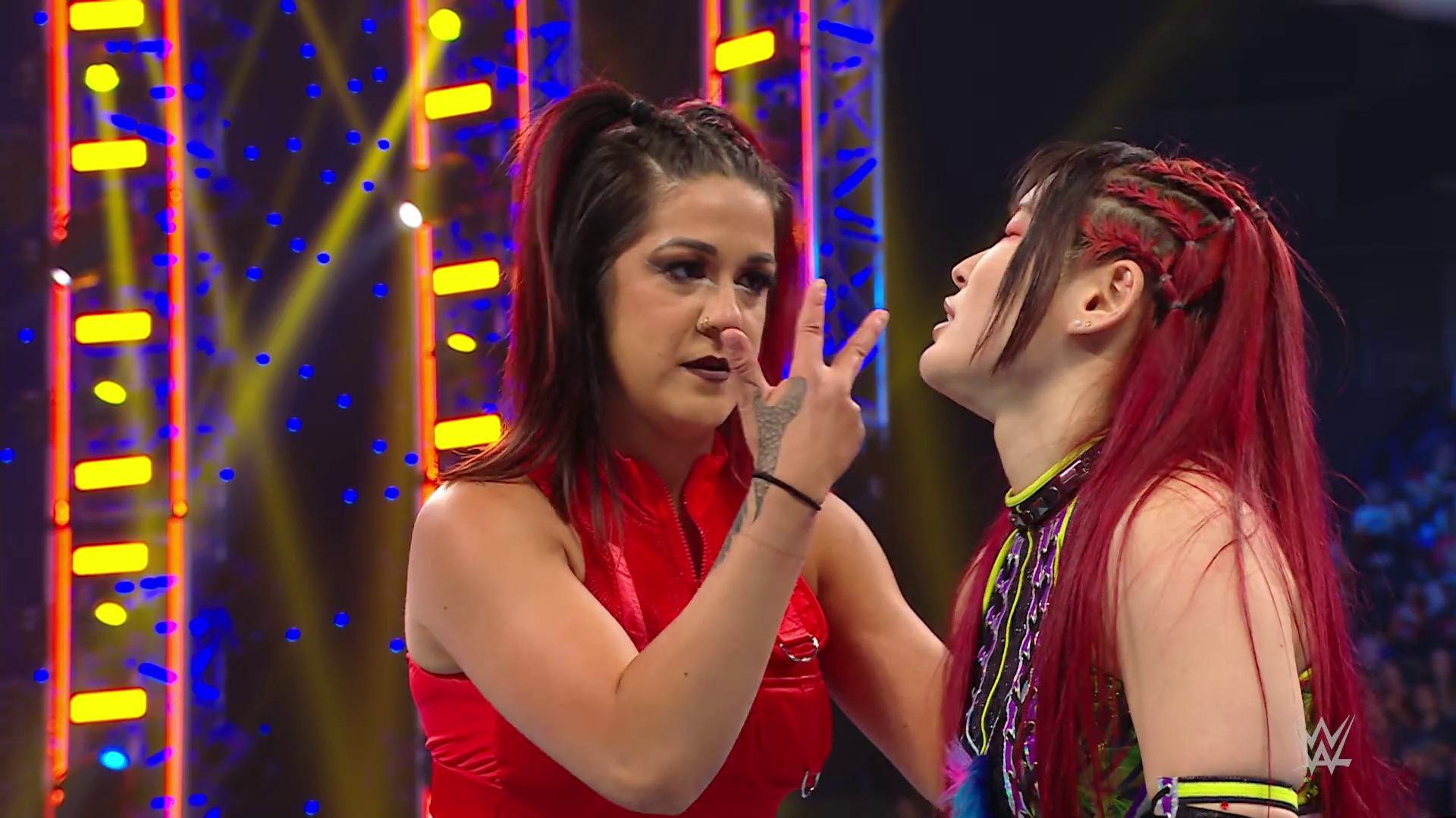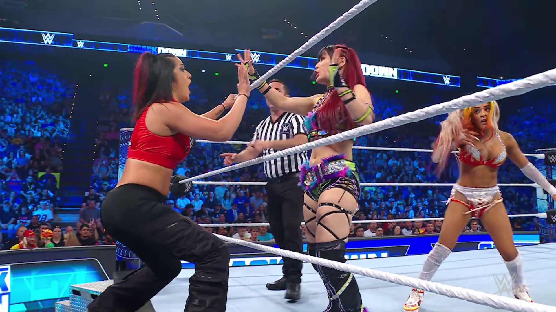 On the June 16th 2023 episode of SmackDown, IYO faced Zelina. Bayley got up on the apron to provide a distraction to assist SKY. IYO came up behind Vega to roll her up for a pin only for Zelina to counter with a waistlock. SKY nearly collided with Bayley. The referee was distracted admonishing Bayley, missing SKY countering Vega's waistlock into a roll-up. Bayley shouted at the referee to return his attention to the match, pointing at the pin. The referee was too late and Vega kicked out. IYO turned her gaze to Bayley, shouting aggressively at her.