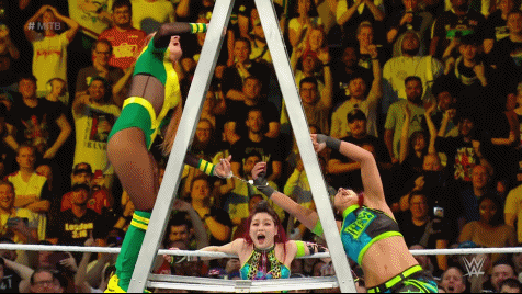 The Role Model picked up the ladder and climbed to the top, reaching a hand up to grab the briefcase. Becky hurried up the other side, using the hand that Trish had handcuffed like a mandible claw to force Bayley to the canvas. Lynch made her climb. Bayley recovered, hurrying up the opposite. SKY pulled Becky to the canvas but Lynch shot back with a big boot. It was down to Bayley and Becky. Fittingly, the very rivalry in which the dissension in Damage CTRL began to surface.